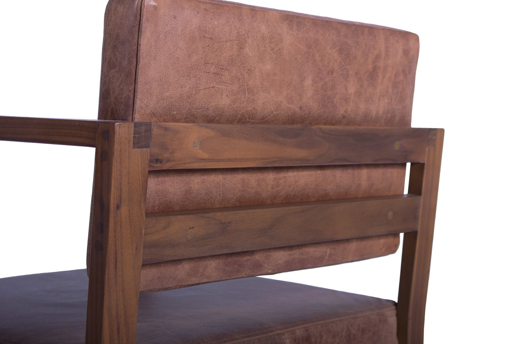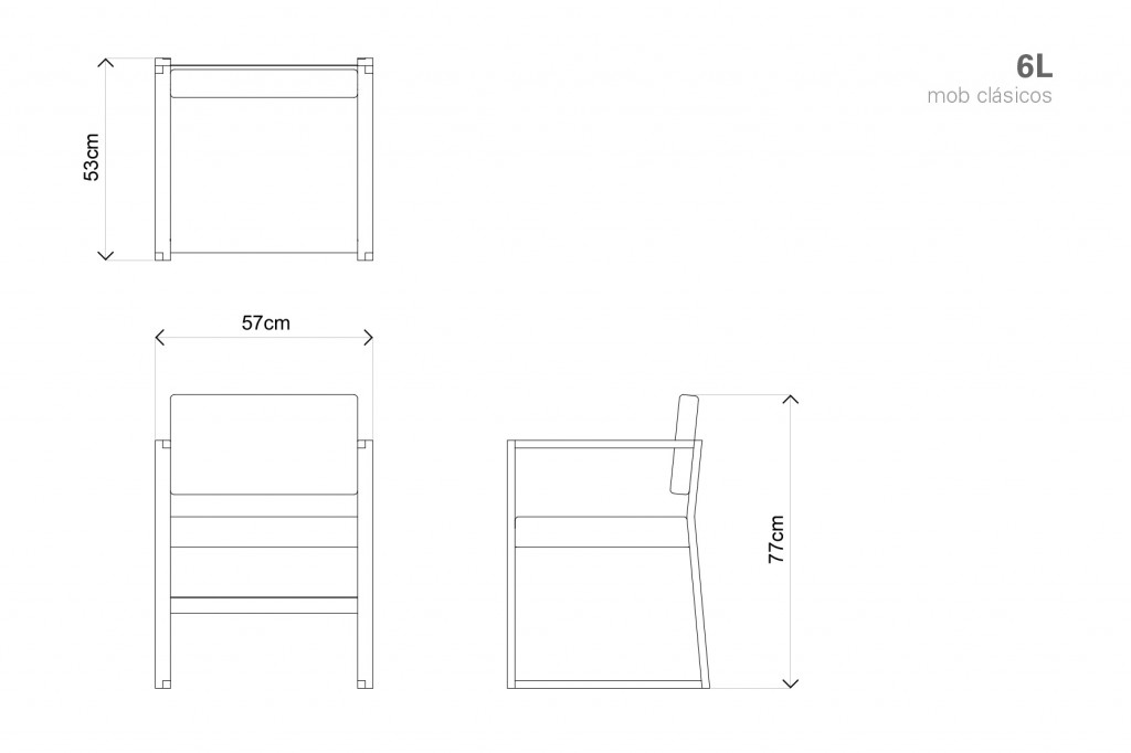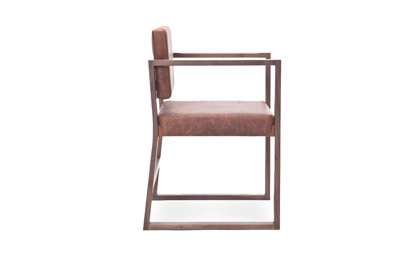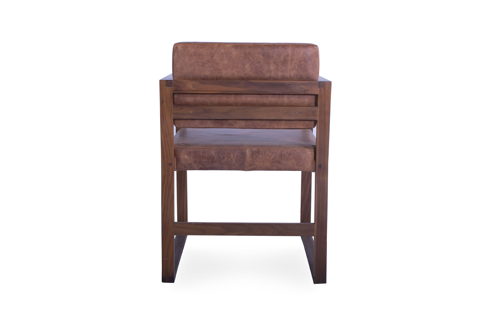 Silla para comedor con descansa brazos tapizada en piel y tela.