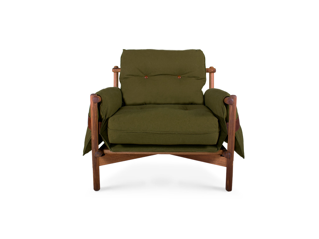 Sillón versátil fabricado en madera maciza, asiento de tela con detalles en piel.